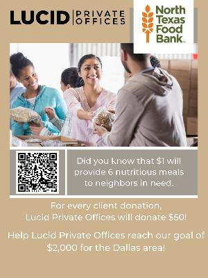 Lucid Private Offices is hosting a virtual food drive to support the North Texas Food Bank (NTFB) and their mission to close the hunger gap in North Texas by providing access to nutritious food. Whether you shop from our cart or donate directly, every dollar donated equals three meals. Your gift makes an incredible impact for children, older adults and families facing hunger in our community.